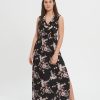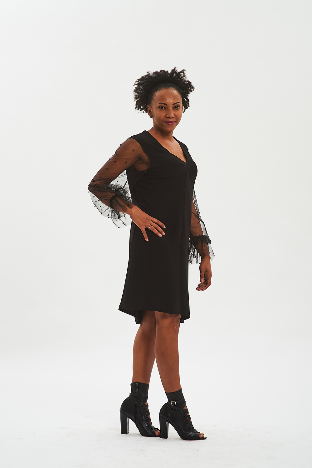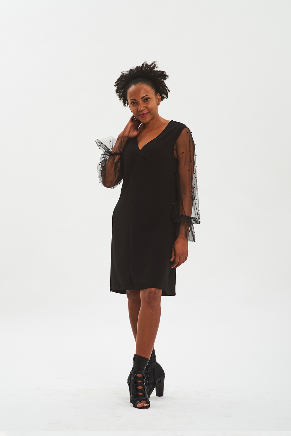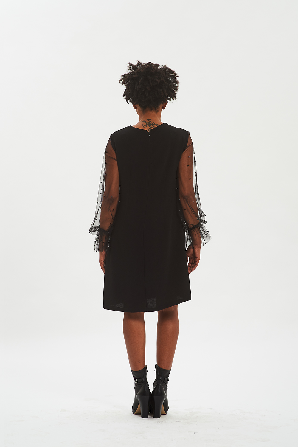 Abito scollo a V, manica lunga a sbuffo trasparente con perle nere cucite.
